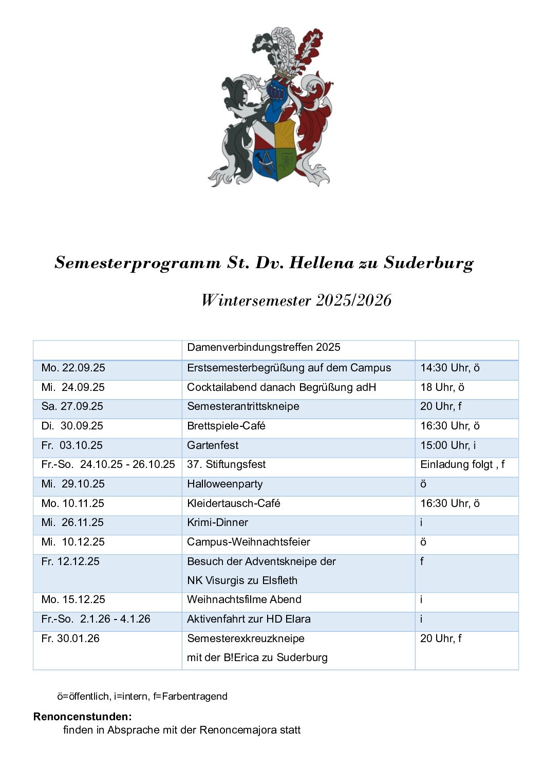 Wir sind die Studentische Damenverbindung Hellena zu Suderburg. Gegründet wurden wir am 26.10.1988 mit den Farben Anthrazit – Weiß – Bordeaux.